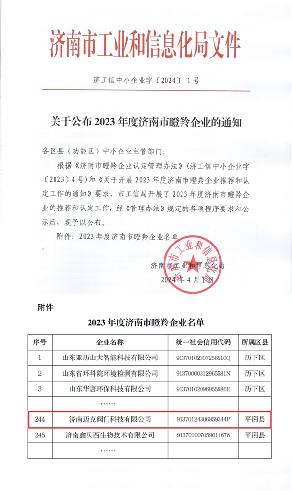 2024年04月07日,濟南市工業(yè)和信息化局發(fā)布《關(guān)于公布2023年度濟南市瞪羚企業(yè)的通知》,經(jīng)區(qū)(縣)中小企業(yè)主管部門初審、專家評審、現(xiàn)場第三方審核等重重審核,玫德集團旗下邁克閥門成功通過2023年度濟南市瞪羚企業(yè)認定。