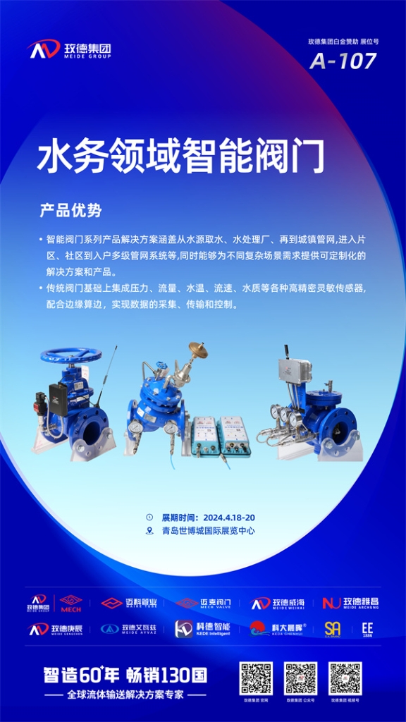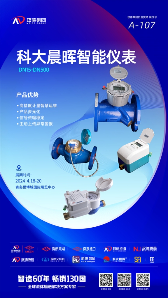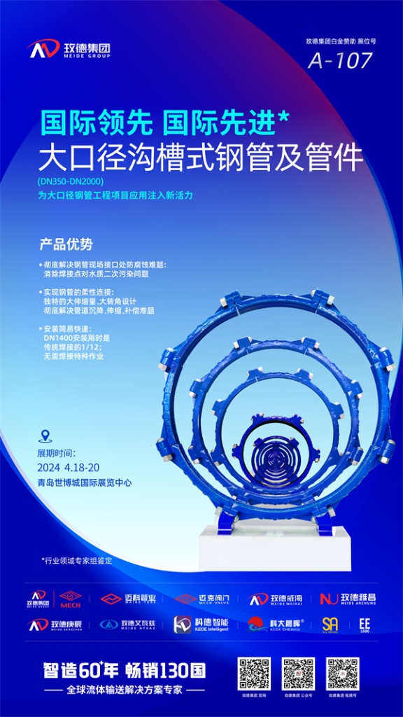 2024年4月18日-20日,玫德集團作為白金贊助商攜手中國水協在青島召開中國城鎮供水排水協會2024年會暨城鎮水務技術與產品交流展示會。屆時玫德集團會展出大口徑溝槽式鋼管及管件、科大晨暉智能儀表、水務領域智能閥門、不銹鋼管材管件、智慧水務整體解決方案等軟硬兼具的一站式產品及解決方案。
